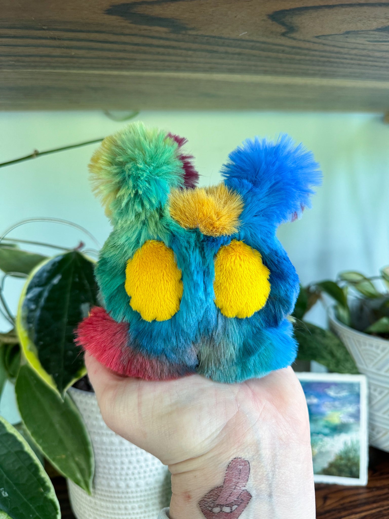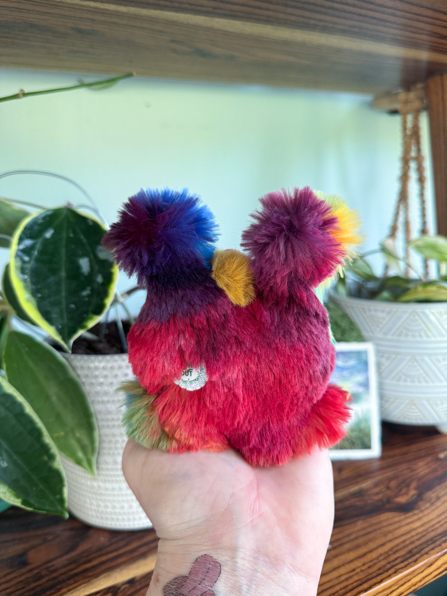 Approx 4” tall, tie dye Sharpei faux fur weighted with glass micro beads and stuffed with poly fil (ages 3+)